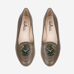 A Loafer Musgo é feita em couro verde musgo com sola em couro marrom, possuindo um broche frontal exclusivo elevando ainda mais o charme do calçado.