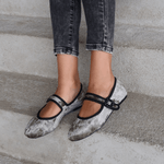 Sapato estilo Mary Jane, com sola de couro e confeccionado em veludo Grafite. Detalhe em pedraria aplicada em cima da tira do cabedal, dando um toque feminino e romântico ao modelo.