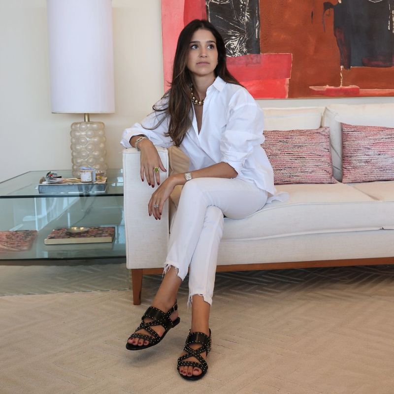 Sandália artesanal, 100% handmade, confeccionada em Couro. Possui tiras em preto com tachas douradas por todo o calçado. Fechamento ajustável com fivela, garantindo conforto e estilo em cada passo.