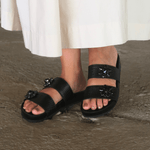 Toda em couro no tom Preto com sola de borracha, a Rasteira Slider chega para deixar sua produção mais cool e elegante. As pedrarias no tom do couro dão o ar sofisticado para a rasteira.
