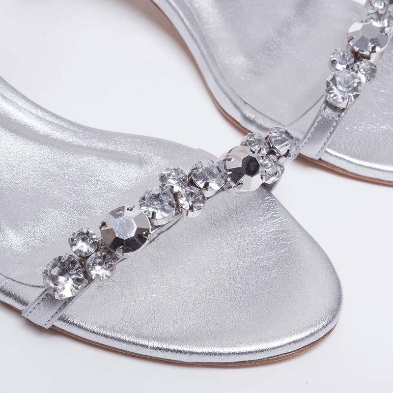 A Sandália Dots possui salto de 5cm e é toda confeccionada em Couro prata metalizado, com pedraria na tira frontal e no tornozelo, trazendo exclusividade, elegância e muita modernidade ao calçado.
