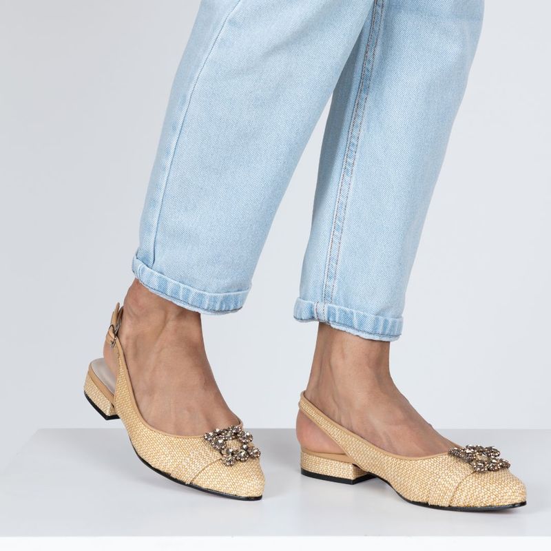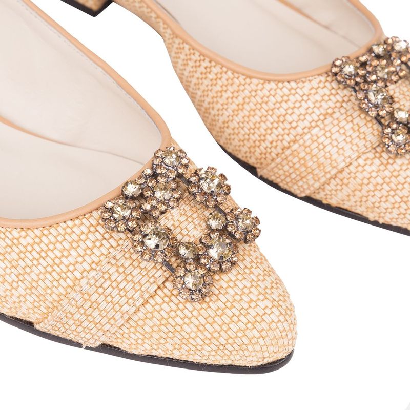 As sapatilha em estilo SlingBack com bico levemente afinado e salto bloco baixo. Confeccionada artesanalmente em palha, com forro e sola de couro e fivela de pedraria exclusiva.