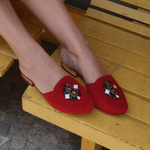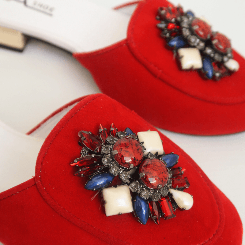 A Slip On Rubi é confeccionada em camurça, possuindo um broche frontal exclusivo elevando ainda mais o charme do calçado.